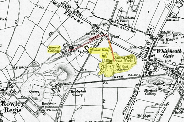 1902 OS map showing the location of Ramrod Hall Brickworks with Ramrod Hall sandwiched in-between the colliery & brickworks at this date. Also to note is the tramway (coloured red) which goes from the colliery to the main road & then to the brickworks, hence backing up my thoughts that the brickworks was owned by the Earl of Dudley.